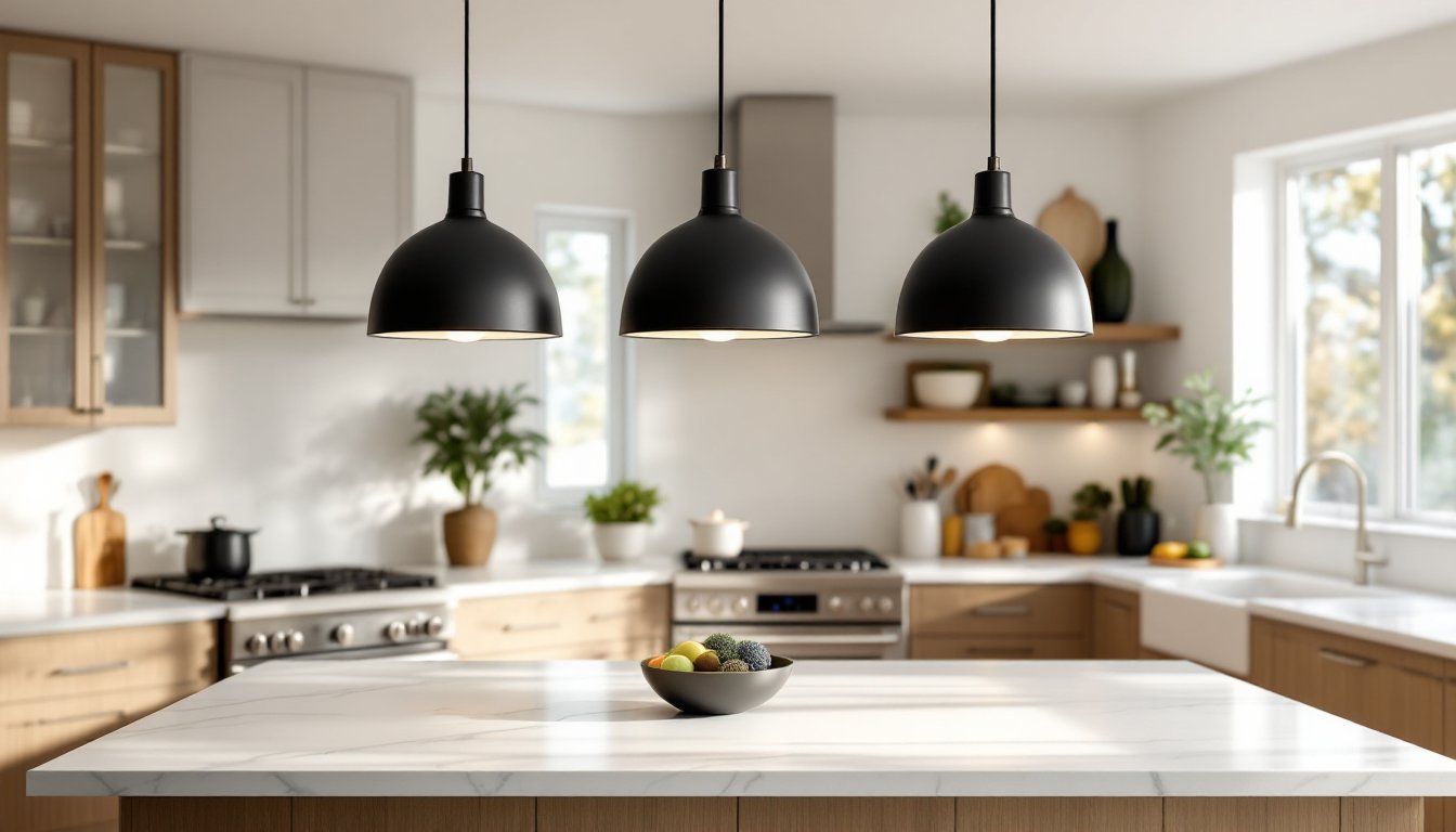 Look for matte black or brushed aluminum fixtures in shapes like spheres, cylinders, or shallow domes. Many homeowners pair 2–3 small minimalist pendants over an island rather than one large fixture. This approach distributes light more evenly and creates visual interest without visual clutter.