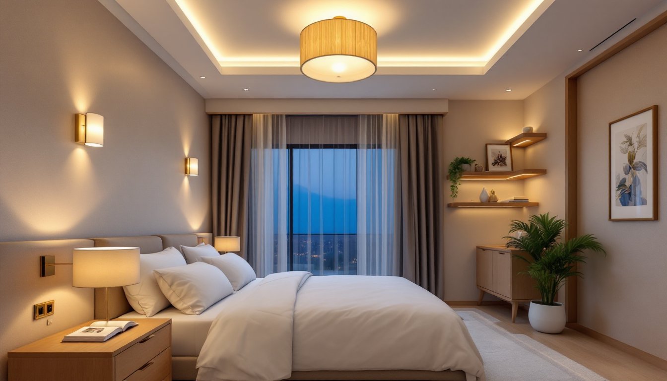 Ambient lighting is your foundation, the soft, overall glow that fills the room without creating dark corners or harsh shadows. A ceiling-mounted fixture typically handles this job, but it doesn’t have to be a standard dome or flush mount. Recessed lights spaced 4 to 6 feet apart work well in larger bedrooms and keep the ceiling visually clean. A chandelier or semi-flush fixture adds style while still providing gentle, diffused light. The key is choosing a fixture that distributes light evenly without pointing directly downward into your eyes when you’re lying in bed.